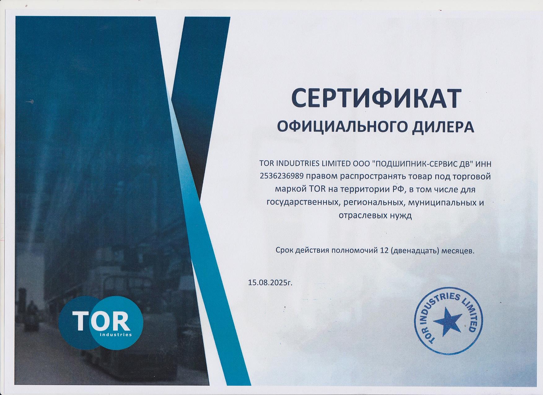Официальный дилер "TOR INDUDTRIES LIMITED" на территории РФ